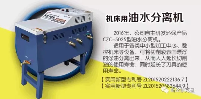2016年,公司自主研發(fā)環(huán)保產(chǎn)品CZC-5025型油水分離機(jī)。適用于各類中小型加工中心、數(shù)控機(jī)床等設(shè)備,可將切削液表面漂浮的浮油分離出來,從而大大延長(zhǎng)切削液的使用壽命,同時(shí)延長(zhǎng)了刀具的使用壽命。